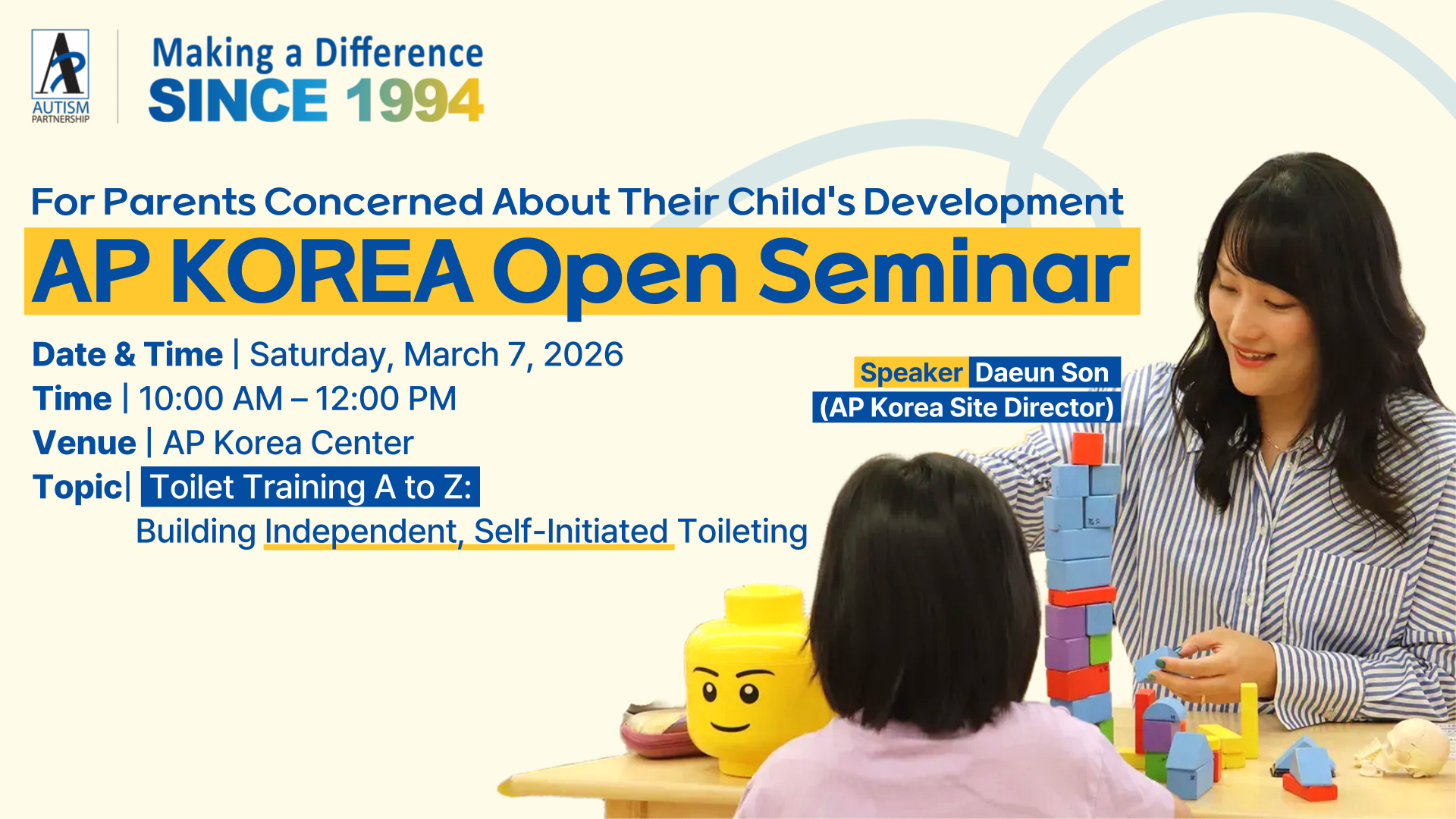Drawing from extensive clinical experience, we will guide parents through the entire process—from getting started, navigating repeated setbacks, to supporting children in learning how to independently request bathroom use. The seminar will provide a clear, step-by-step understanding of toilet training from A to Z.